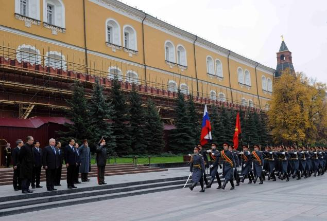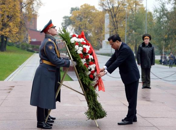 ????新華網(wǎng)北京10月14日電 據(jù)新華社“新華國際”客戶端報道,一場秋雨洗滌了莫斯科的寒夜。13日一早,克強總理來到克里姆林宮外的無名烈士墓,憑吊衛(wèi)國戰(zhàn)爭中的犧牲者。