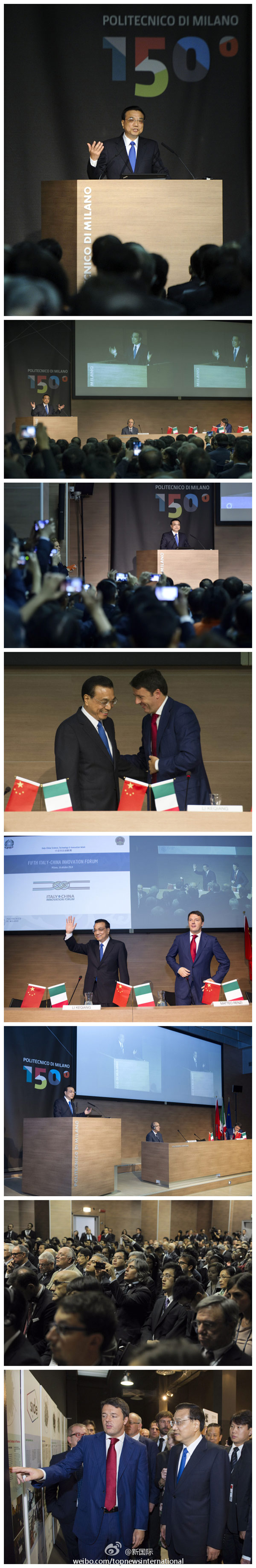 ????新華網(wǎng)北京10月16日電 據(jù)新華社“新國際”微博報道,李克強總理16日在意大利總理倫齊陪同下在米蘭理工大學(xué)出席中意創(chuàng)新周大會時說,我們的時代是創(chuàng)新的時代,科技創(chuàng)新不僅來自對科學(xué)的了解,對技術(shù)的把握,也源自創(chuàng)意,希望中意青年用東西方智慧碰撞出更多“奇思妙想”,讓創(chuàng)意促進(jìn)創(chuàng)新,進(jìn)而提升兩國產(chǎn)業(yè)競爭力。