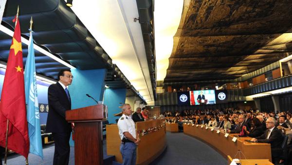 10月15日,中國(guó)國(guó)務(wù)院總理李克強(qiáng)在格拉齊亞諾總干事的陪同下在位于羅馬的聯(lián)合國(guó)糧農(nóng)組織總部發(fā)表演講。 新華社 圖