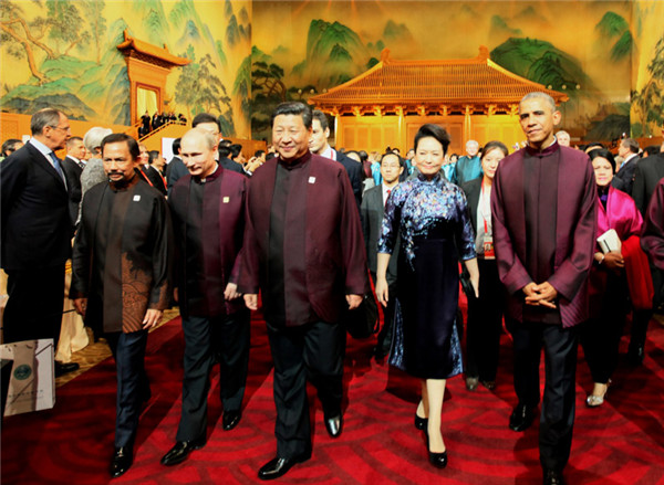 ????18時(shí)許,與會(huì)貴賓穿著為本次會(huì)議專門設(shè)計(jì)的特色中式服裝陸續(xù)抵達(dá)。習(xí)主席說,貴賓們都穿著中國(guó)式服裝,讓大家更感親近,就像到鄰居家串門,來朋友家敘舊一樣。
