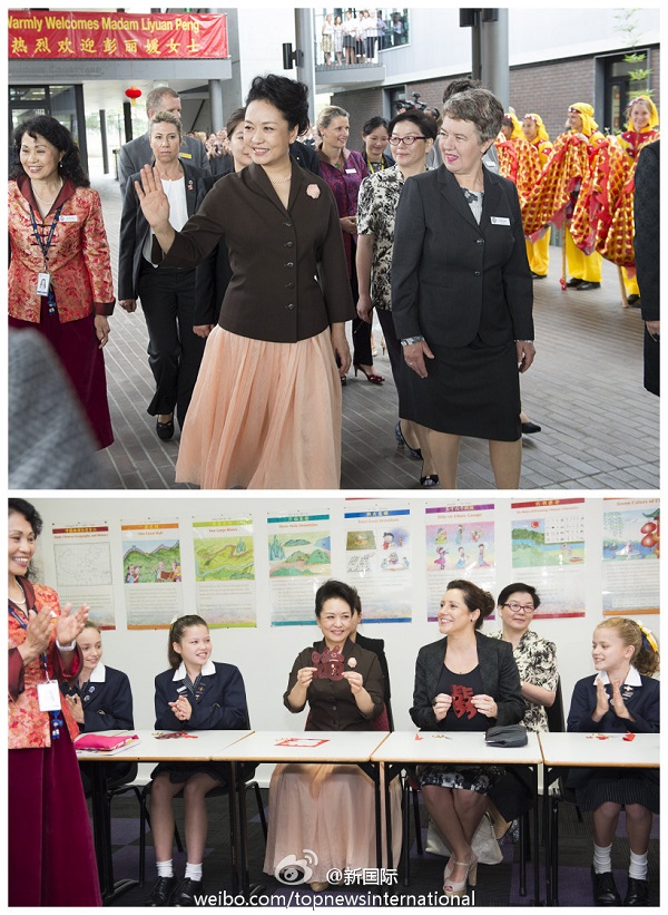 ??? 新華網(wǎng)北京11月19日電 據(jù)新華社“新國際”微博報(bào)道,習(xí)近平主席夫人彭麗媛19日在悉尼參觀育文武女子學(xué)校,在舞龍隊(duì)引導(dǎo)下來到孔子課堂。“白日依山盡……”16名女孩朗誦《登鸛雀樓》,還學(xué)打中國結(jié)、制作剪紙、繡織漢字“中澳友誼長存”。彭麗媛拿起剪刀,剪出一個(gè)“?!弊?。?