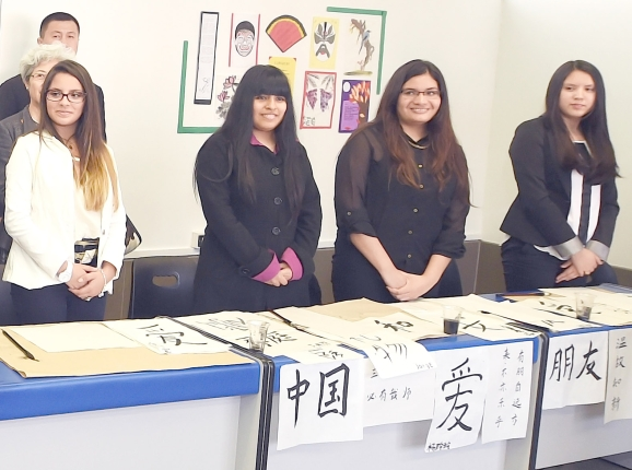??? 隨后,張德江走進一間教室,這里掛著紅紅的“中國結”、燈籠,墻上貼著一幅對聯(lián)“根深則葉茂,源遠而流長”。學生們有的在看中文書、有的在剪紙、還有的在練書法。