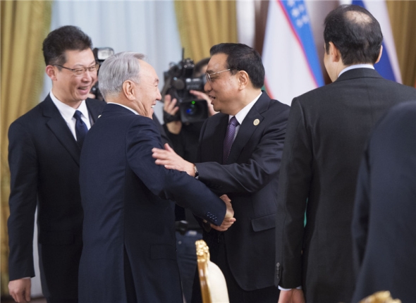 ????(納扎爾巴耶夫總統(tǒng)在集體會見上合組織成員國總理、秘書長和地區(qū)反恐機構執(zhí)委會主任時,與克強總理相談甚歡,攝影記者:黃敬文)