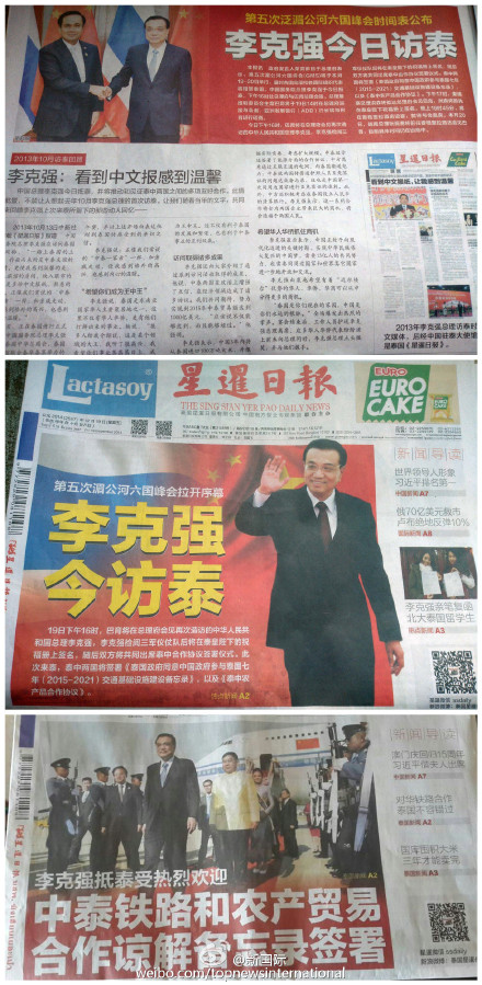 ??? 新華網(wǎng)北京12月20日電 據(jù)新華社“新國(guó)際”微博報(bào)道,泰國(guó)媒體紛紛在頭版頭條位置對(duì)李克強(qiáng)總理的泰國(guó)之行予以報(bào)道,社會(huì)各界高度關(guān)注。泰國(guó)《星暹日?qǐng)?bào)》在頭版刊登總理大幅照片,稱總理此行將推動(dòng)和見證中泰兩國(guó)之間簽署多份友好合作協(xié)議,并回顧了2013年李克強(qiáng)總理訪泰時(shí)的情景。