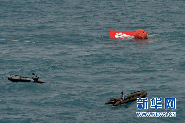 ??? 1月10日,工作人員駕駛橡皮艇協(xié)助打撈亞航失事客機的機尾殘骸。 據報道,搜救人員當日已將亞航失事客機的機尾殘骸撈出海面。 新華社發(fā)