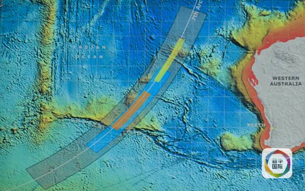 6月26日,澳方宣布,根據(jù)多國衛(wèi)星專家小組對已有衛(wèi)星信息進(jìn)行的重新分析,MH370航班的搜尋將轉(zhuǎn)入新區(qū)域,新搜索區(qū)域位于“藍(lán)鰭金槍魚”此前搜索區(qū)域以南,距離西澳大利亞海岸約1800公里,面積約6萬平方公里,仍在根據(jù)衛(wèi)星與飛機(jī)“握手”信息而確定的第七條弧線上。圖為澳方公布的新區(qū)域,橙色區(qū)域是優(yōu)先級最高的搜尋區(qū),藍(lán)色區(qū)次之。(新華社記者徐海靜攝)