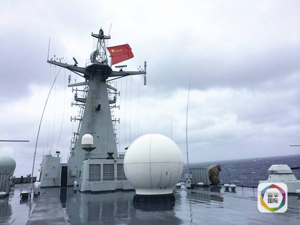 這是2014年4月23日拍攝的在風(fēng)浪里堅持執(zhí)行搜索任務(wù)的中國海軍井岡山艦。(新華社記者白瑞雪攝)
