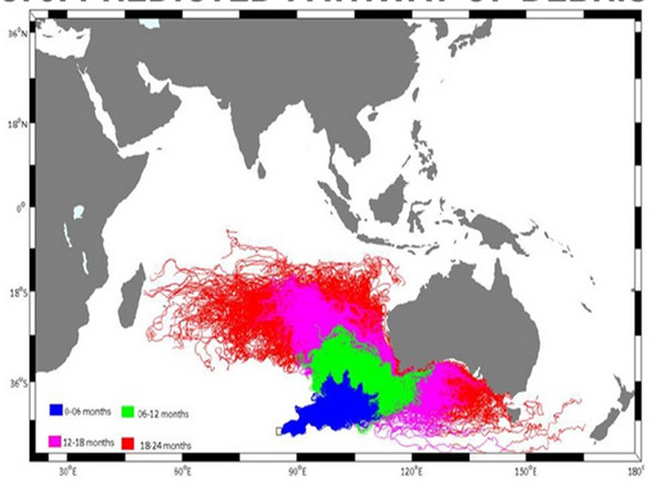 ?。ㄎ靼拇罄麃喆髮W研究人員繪制的殘骸可能漂流路徑圖,紅色為18-24個月可能出現(xiàn)殘骸的區(qū)域,粉色為12到18個月,綠色為6到12個月,藍色為六個月之內(nèi)。)