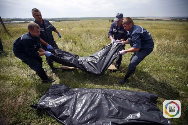 2014年7月19日,在烏克蘭頓涅茨克州的MH17航班墜機(jī)現(xiàn)場(chǎng),烏克蘭緊急情況部工作人員搬運(yùn)遇難者遺體。新華社/路透