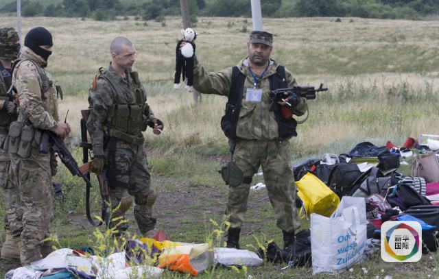 2014年7月18日,一名當(dāng)?shù)孛耖g武裝人員在烏克蘭頓涅茨克州格拉博夫附近的馬航客機(jī)墜機(jī)現(xiàn)場(chǎng)拿起一個(gè)玩具。新華社/美聯(lián)