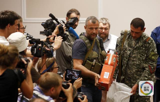 2014年7月22日凌晨,在烏克蘭頓涅茨克州,烏克蘭東部民間武裝代表正在向媒體展示黑匣子。烏克蘭東部民間武裝領(lǐng)導(dǎo)人、“頓涅茨克人民共和國(guó)”總理博羅代22日凌晨將馬航MH17航班客機(jī)黑匣子交給馬來(lái)西亞方面。新華社/路透