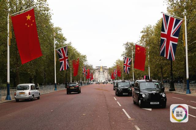 ????10月17日,在英國(guó)倫敦,中國(guó)國(guó)旗與英國(guó)國(guó)旗懸掛在白金漢宮前的林蔭路兩旁。