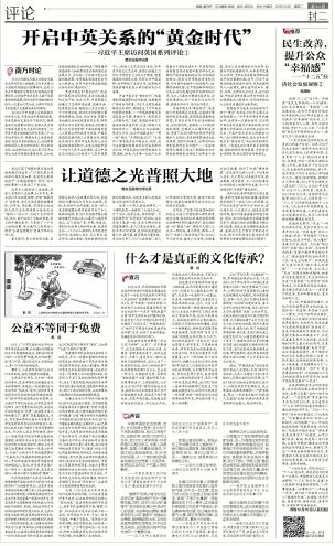 英國駐華大使吳百納連續(xù)用了四個“黃金”來形容習近平主席此次訪英的意義:“今年是中英關系的黃金年,這將是一次黃金訪問,它證明中英關系的發(fā)展處于黃金時期。訪問將確立中英面向21世紀的全球伙伴關系,開啟中英關系史上的黃金10年。”我們期待并相信,這次為開啟中英關系“黃金時代”而往的里程碑式訪問,一定能成功打造中英關系新格局、繪制兩國關系新藍圖、開辟務實合作新前景、樹立國際合作新典范。(南方日報評論員)