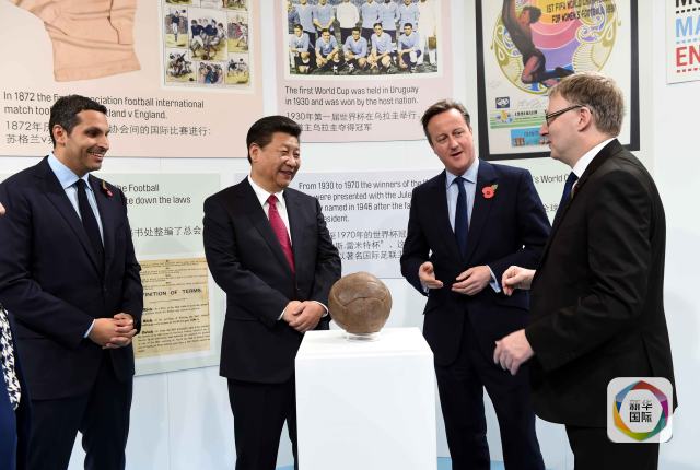 10月23日,國家主席習(xí)近平在英國首相卡梅倫陪同下,參觀曼徹斯特城市足球?qū)W院。新華社記者 饒愛民 攝