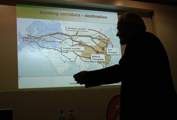 ↑投影顯示目前從中國聯(lián)通歐洲大陸的幾條鐵路線。