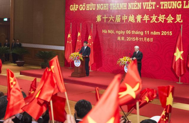 11月6日,中共中央總書(shū)記、國(guó)家主席習(xí)近平和越共中央總書(shū)記阮富仲在河內(nèi)共同會(huì)見(jiàn)參加第十六屆中越青年友好會(huì)見(jiàn)活動(dòng)的中越青年代表。新華社記者李學(xué)仁攝