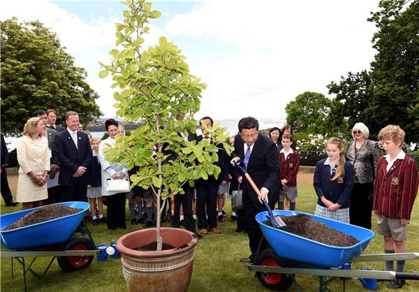 圖為2014年11月18日,習(xí)近平在澳大利亞塔斯馬尼亞州與小學(xué)生共同植樹(shù)。(饒愛(ài)民攝)
