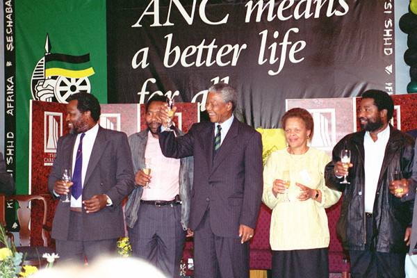 1994年5月2日,曼德拉和他的戰(zhàn)友們在約翰內斯堡的卡爾頓飯店大廳慶祝當選總統(tǒng)。(新華社發(fā))