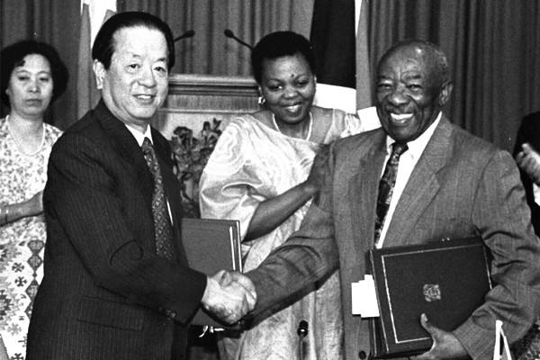 1997年12月30日,中國與南非簽署建交聯(lián)合公報。圖為錢其琛與恩佐交換文本后握手。(新華社記者李學仁攝)