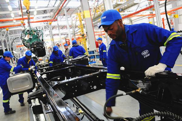 2014年7月10日,中國第一汽車集團在南非東開普省曼德拉灣市舉行南非庫哈工廠落成及首輛機車下線儀式。圖為工人在中國一汽南非工廠生產(chǎn)線上工作。 (新華社記者張川石攝)