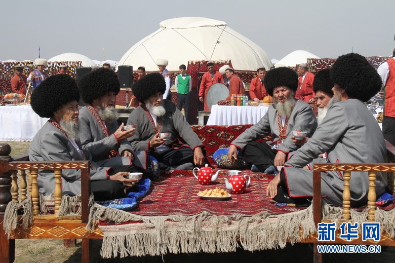 3月21日,在土庫曼斯坦首都阿什哈巴德,長老們喝茶聊天。新華社記者盧敬利 攝