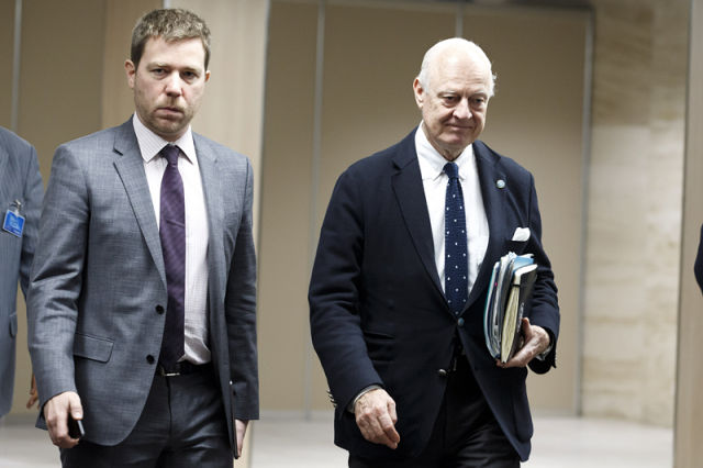 3月18日,在瑞士日內(nèi)瓦聯(lián)合國(guó)歐洲總部,聯(lián)合國(guó)敘利亞問題特使德米斯圖拉(右)準(zhǔn)備參加敘利亞問題新一輪和談。 新華社/美聯(lián)