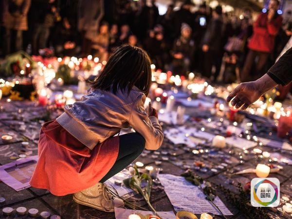 布魯塞爾市中心廣場(chǎng),女孩點(diǎn)燃悼念蠟燭。(圖片來源:新華/美聯(lián))