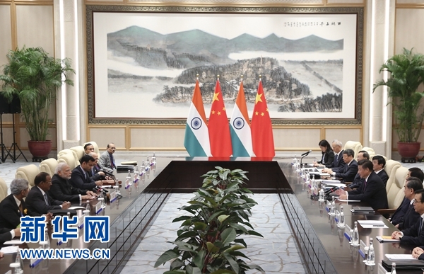 9月4日,國家主席習(xí)近平在杭州會(huì)見在華出席二十國集團(tuán)領(lǐng)導(dǎo)人杭州峰會(huì)的印度總理莫迪。 新華社記者 丁林 攝