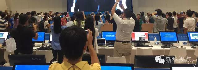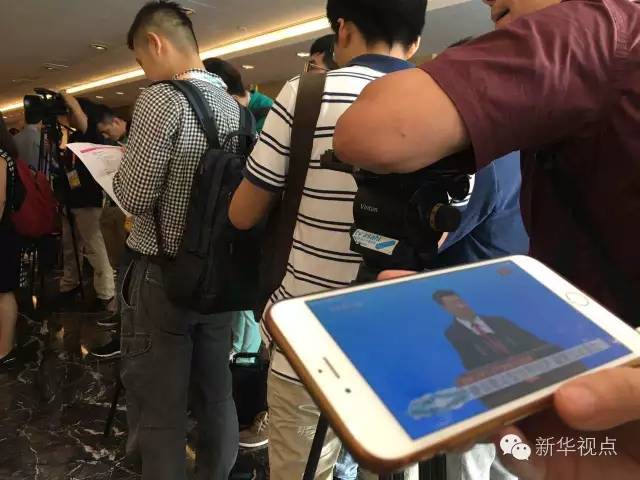 由于峰會(huì)現(xiàn)場場地有限,許多記者無法到會(huì)場實(shí)地進(jìn)行采訪報(bào)道。不愿錯(cuò)過精彩瞬間的他們架起“長槍短炮”,對準(zhǔn)新聞中心內(nèi)正在直播開幕式實(shí)況的大屏幕。