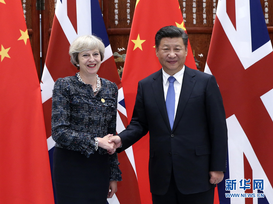 9月5日,國(guó)家主席習(xí)近平在杭州會(huì)見來(lái)華出席二十國(guó)集團(tuán)領(lǐng)導(dǎo)人峰會(huì)的英國(guó)首相特雷莎·梅。 新華社記者龐興雷攝