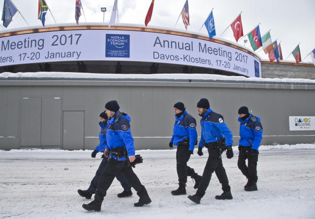 1月15日,在瑞士達沃斯,警察走過即將舉辦世界經(jīng)濟論壇年會的會議中心。(新華/美聯(lián))