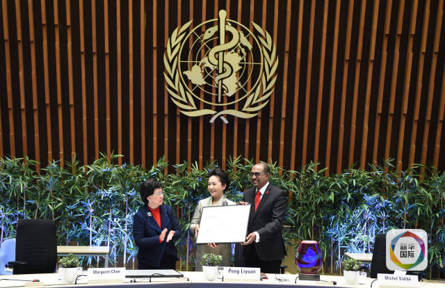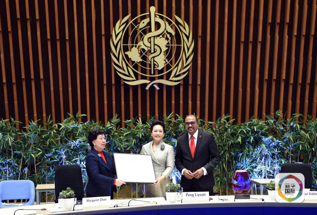 1月18日,國家主席習(xí)近平夫人、世界衛(wèi)生組織結(jié)核病和艾滋病防治親善大使彭麗媛應(yīng)世界衛(wèi)生組織總干事陳馮富珍和聯(lián)合國艾滋病規(guī)劃署執(zhí)行主任西迪貝邀請,在瑞士日內(nèi)瓦出席為她舉行的親善大使任期續(xù)延暨頒獎(jiǎng)儀式。這是世界衛(wèi)生組織總干事陳馮富珍向彭麗媛頒發(fā)世衛(wèi)組織榮譽(yù)勛章。(新華社記者謝環(huán)馳攝)