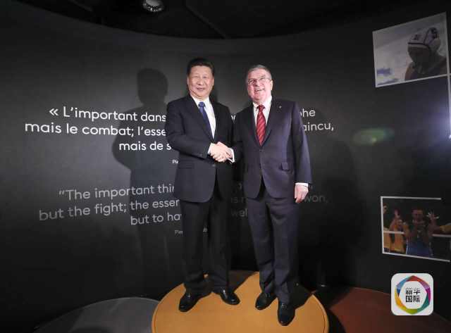 1月18日,國(guó)家主席習(xí)近平在瑞士洛桑國(guó)際奧林匹克博物館會(huì)見(jiàn)國(guó)際奧林匹克委員會(huì)主席巴赫。這是習(xí)近平和巴赫在奧運(yùn)冠軍領(lǐng)獎(jiǎng)臺(tái)上合影。(新華社記者 蘭紅光 攝)