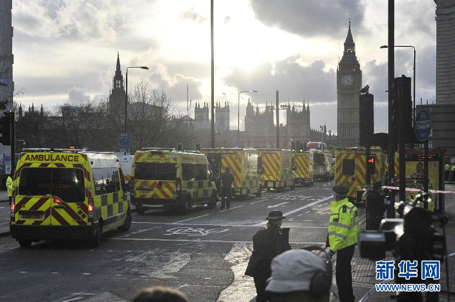 ??? 3月22日,救護車在英國倫敦的議會大廈外待命。 英國警方22日晚宣布,已有4人在倫敦市中心的襲擊事件中死亡,另有20多人受傷。新華社發(fā)(蒂姆·愛爾蘭攝)