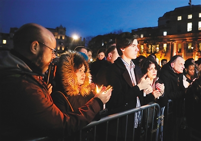 3月23日,在英國(guó)倫敦特拉法加廣場(chǎng),人們參加燭光守夜悼念活動(dòng)。新華社記者 韓 巖攝