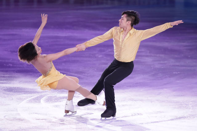4月2日,中國選手隋文靜(左)/韓聰在表演中。當(dāng)日,2017花樣滑冰世錦賽在芬蘭赫爾辛基落幕。(新華社發(fā),馬蒂凱寧攝)