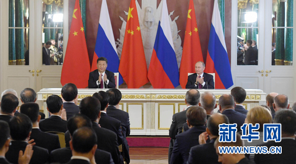 7月4日,國家主席習(xí)近平在莫斯科克里姆林宮同俄羅斯總統(tǒng)普京舉行會談。會談后,兩國元首簽署了《中華人民共和國和俄羅斯聯(lián)邦關(guān)于進(jìn)一步深化全面戰(zhàn)略協(xié)作伙伴關(guān)系的聯(lián)合聲明》《中華人民共和國和俄羅斯聯(lián)邦關(guān)于當(dāng)前世界形勢和重大國際問題的聯(lián)合聲明》,批準(zhǔn)了《〈中華人民共和國和俄羅斯聯(lián)邦睦鄰友好合作條約〉實(shí)施綱要(2017年至2020年)》并見證了《中華人民共和國外交部和俄羅斯聯(lián)邦外交部關(guān)于朝鮮半島問題的聯(lián)合聲明》以及經(jīng)貿(mào)、農(nóng)業(yè)、能源、基礎(chǔ)設(shè)施建設(shè)、金融、文化、創(chuàng)新、媒體、信息網(wǎng)絡(luò)、檢驗(yàn)檢疫等領(lǐng)域多項(xiàng)雙邊合作文件的交換。新華社記者 饒愛民 攝