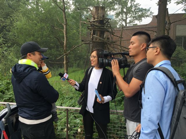 因為大熊貓?zhí)幵跈z疫期,動物園方面無法安排它們同來自家鄉(xiāng)的記者近距離接觸。看到記者面露失望,尹洪笑著安慰我們:“大家請放心,兩個小貓(昵稱)在這邊一切都好?!?/p>