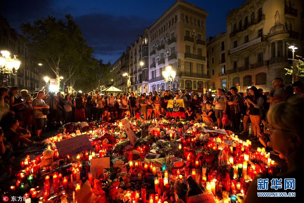 當(dāng)?shù)貢r間2017年8月18日,西班牙巴塞羅那,當(dāng)?shù)孛癖婞c燭獻花悼念恐襲事件遇難者。17日,一輛白色貨車在巴塞羅那市中心蘭布拉大道加泰羅尼亞廣場附近沖撞人群,據(jù)媒體報道,死亡人數(shù)已經(jīng)升至14人。(圖片來源:東方IC)