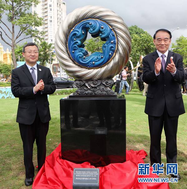 11月9日,在越南峴港APEC公園,中國外交部副部長李保東(右)、商務部副部長王受文(左)共同為中國贈送的雕塑作品《和夢同圓》揭幕。作為2017年亞太經合組織(APEC)領導人會議周的一部分,越南峴港APEC公園9日正式開放,展示21個成員經濟體藝術家創(chuàng)作的雕塑。新華社記者李鵬攝