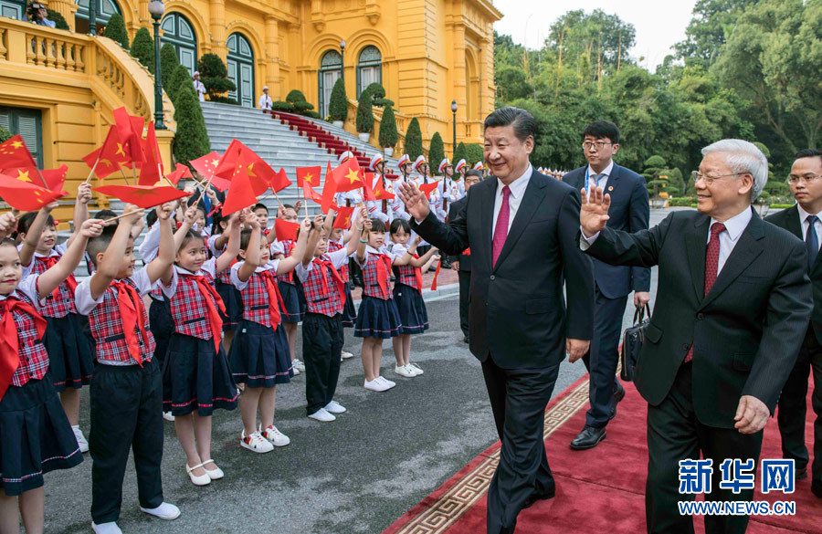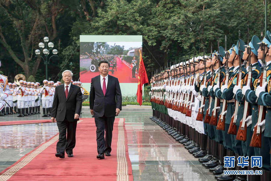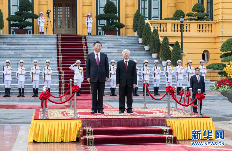 11月12日,中共中央總書記、國家主席習(xí)近平在河內(nèi)越共中央駐地同越共中央總書記阮富仲舉行會談。這是會談前,阮富仲在主席府廣場為習(xí)近平舉行盛大歡迎儀式。 新華社記者 李濤 攝