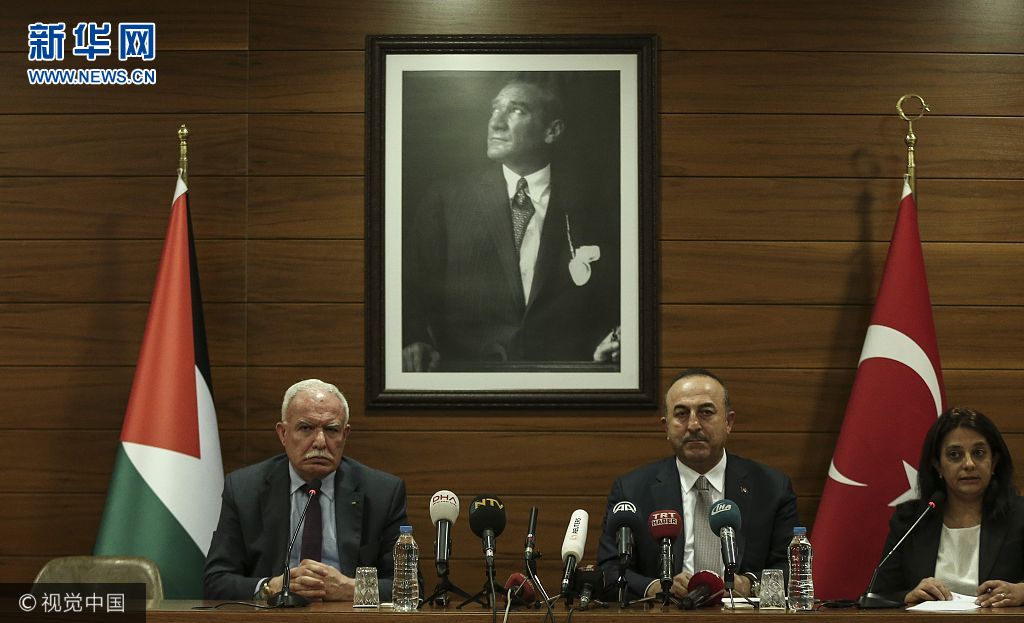 當(dāng)?shù)貢r(shí)間2017年12月20日,土耳其伊斯坦布爾,土耳其外長(zhǎng)恰武什奧盧與巴勒斯坦外長(zhǎng)馬勒基舉行聯(lián)合新聞發(fā)布會(huì),呼吁聯(lián)合國(guó)大會(huì)在21日舉行的緊急會(huì)議上認(rèn)定美國(guó)承認(rèn)耶路撒冷為以色列首都的決定“無效”。(圖片來源:視覺中國(guó))