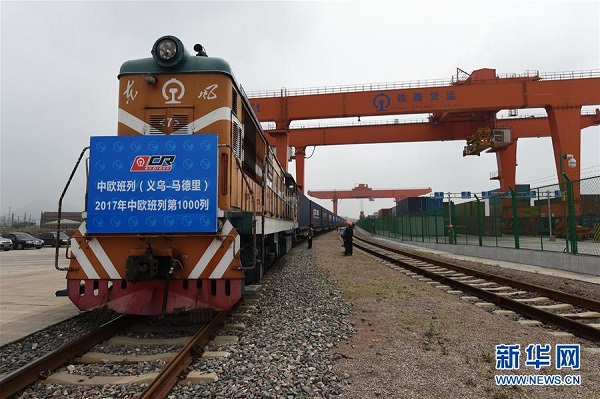 5月13日,2017年第1000列中歐班列從義烏西站駛出。當(dāng)日,X8024次中歐班列(義烏-馬德里)從浙江義烏鐵路西站鳴笛駛出。這列滿載小商品、服裝等貨物的列車是2017年開行的第1000列中歐班列。中國鐵路總公司統(tǒng)計顯示,2017年中歐班列開行數(shù)量較去年同期增加612列,增長158%。新華社發(fā)(龔獻明 攝)