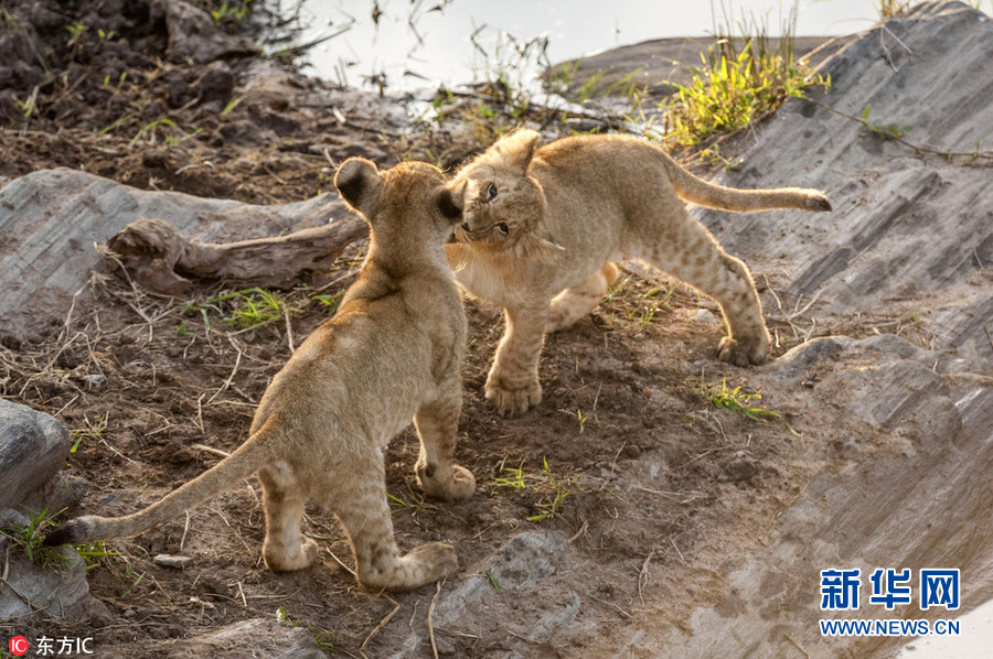1月2日報道(具體拍攝時間不詳),肯尼亞馬賽馬拉國家保護區(qū),64歲的攝影師Ingo Gelach在當(dāng)?shù)嘏臄z到一組有趣又暖心的照片。畫面中,兩頭小獅子站在水邊,似乎正考慮跨越面前的水域。其中一頭獅子用前腳搭在同伴的肩膀上,似乎在表達(dá)友好,又似是在鼓勵同伴不要害怕,勇敢地跨過去。(圖片來源:東方IC)