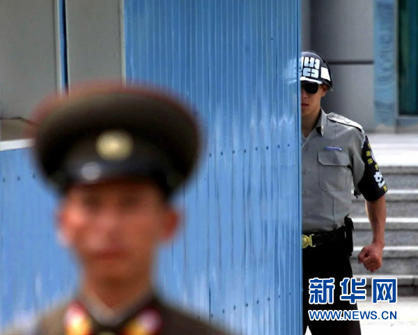 2002年9月19日拍攝的資料照片顯示,一名韓國(guó)憲兵(右)和一名朝鮮人民軍士兵在板門店朝鮮半島軍事分界線兩側(cè)執(zhí)勤。 新華社記者龔兵攝