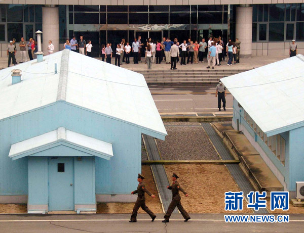 2004年7月26日拍攝的資料照片顯示,來(lái)自世界各國(guó)的游客在板門店韓國(guó)一側(cè)(上)參觀,畫面下部為板門店朝鮮一側(cè)兩名正在執(zhí)勤的朝鮮人民軍士兵。新華社記者姬新龍攝