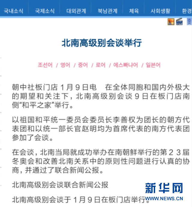 新華社平壤1月10日電(記者程大雨)在外界聚焦9日朝韓高級別會談之際,朝鮮官方媒體的反應(yīng)本身也令人關(guān)注。朝中社9日晚些時(shí)候播發(fā)了相關(guān)報(bào)道,而《勞動新聞》和朝鮮中央電視臺10日分別轉(zhuǎn)引了朝中社報(bào)道。
