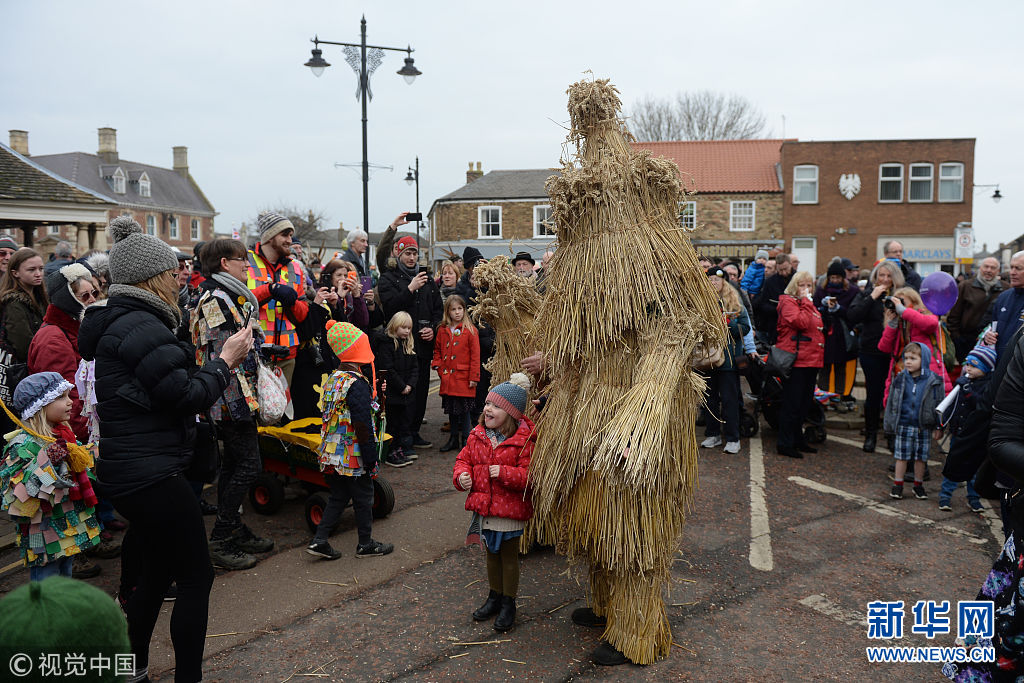 英國(guó)小鎮(zhèn)慶?!暗静菪堋惫?jié) 民眾跟隨草人盡情舞動(dòng)