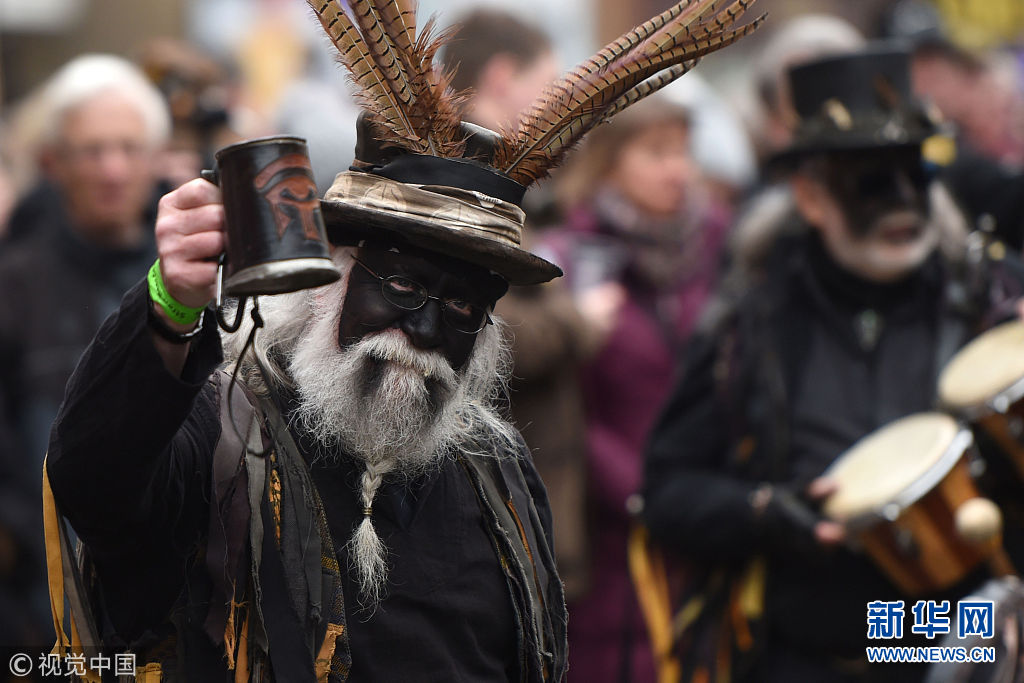 英國小鎮(zhèn)慶?!暗静菪堋惫?jié) 民眾跟隨草人盡情舞動