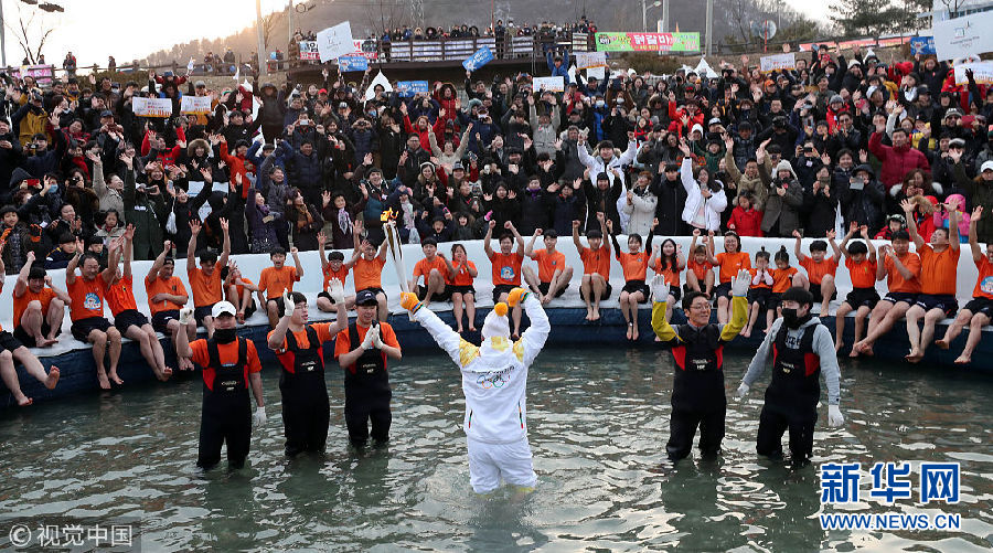 韓國(guó)奧運(yùn)圣火傳遞在鱒魚慶典場(chǎng)地舉行 火炬手嘴含活魚拍照